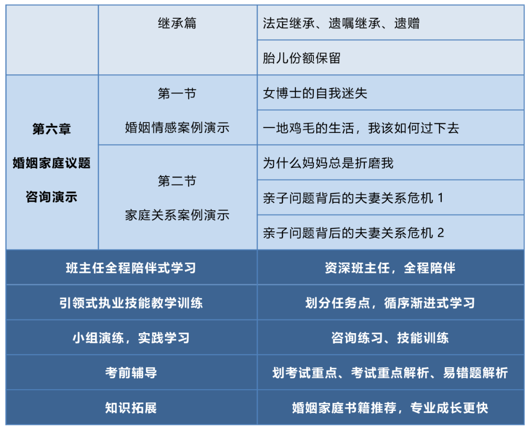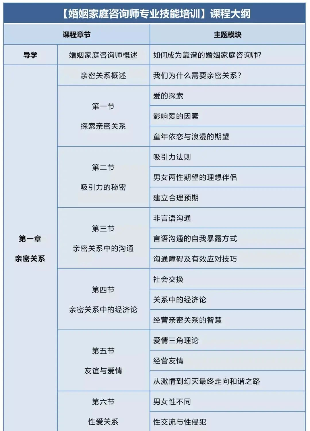 专业系统的讲解婚姻家庭咨询的执业实操理论与技能,并透过案例,结合当今社会婚姻生活中的种种焦点问题,讲授婚姻家庭咨询的方法、脉络,使学员不仅掌握专业知识和技能,还可以从专业角度出发充分的自我成长,并将所学应用到生活中去,助人助己,使家庭和美,实现积极幸福的人生。